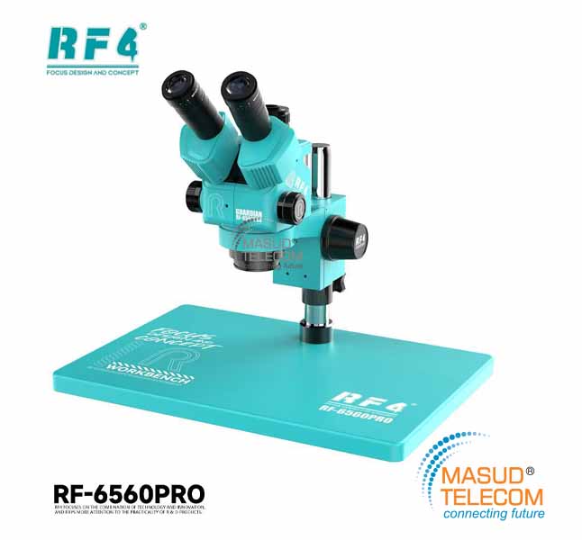 RF RF-6560Pro 6.5X-60X trinocular stereo microscope synchronous zoom for electronic and mobile phone motherboard micro-soldering repair. 380mm*260mm aluminum alloy base, WF10X/23mm wide viewing angle, can be used with different HDMI cameras, suitable for PCB soldering joints, biological research, and school teaching live broadcasts, etc.