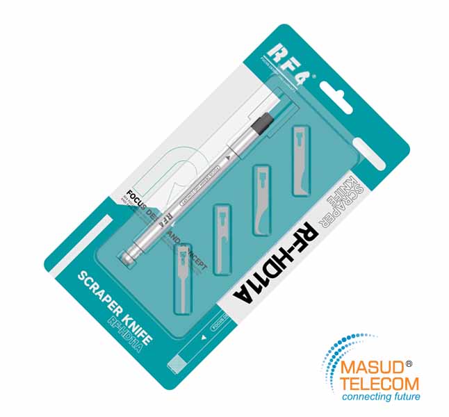RF4 Phone Repair Blade Set: RF4 RF-HD11A 4-in-1 Blades with Handle for Phone PCB Glue Removal and IC Prying Dismantling. RF4 RF-HD12B Ceramic Scraper with non-magnetic ceramic blades for easily scraping away solder tin paste without damaging the stencils. RF4 RF-KH13 RF-KH13A Blade kit with Quick-Release Press Handle is compatible with various blade repair tools for mobile phone repair, including adhesive removal and CPU IC prying.