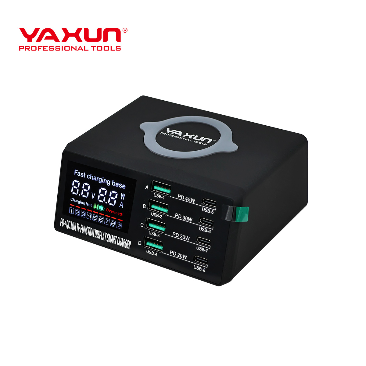 YAXUN X9D Charger is a professional 8-port multi-function fast charging station designed for mobile phones, tablets, and USB-powered devices. This Charger delivers stable and intelligent power distribution, making it ideal for mobile repair shops, offices, and multi-device charging environments.